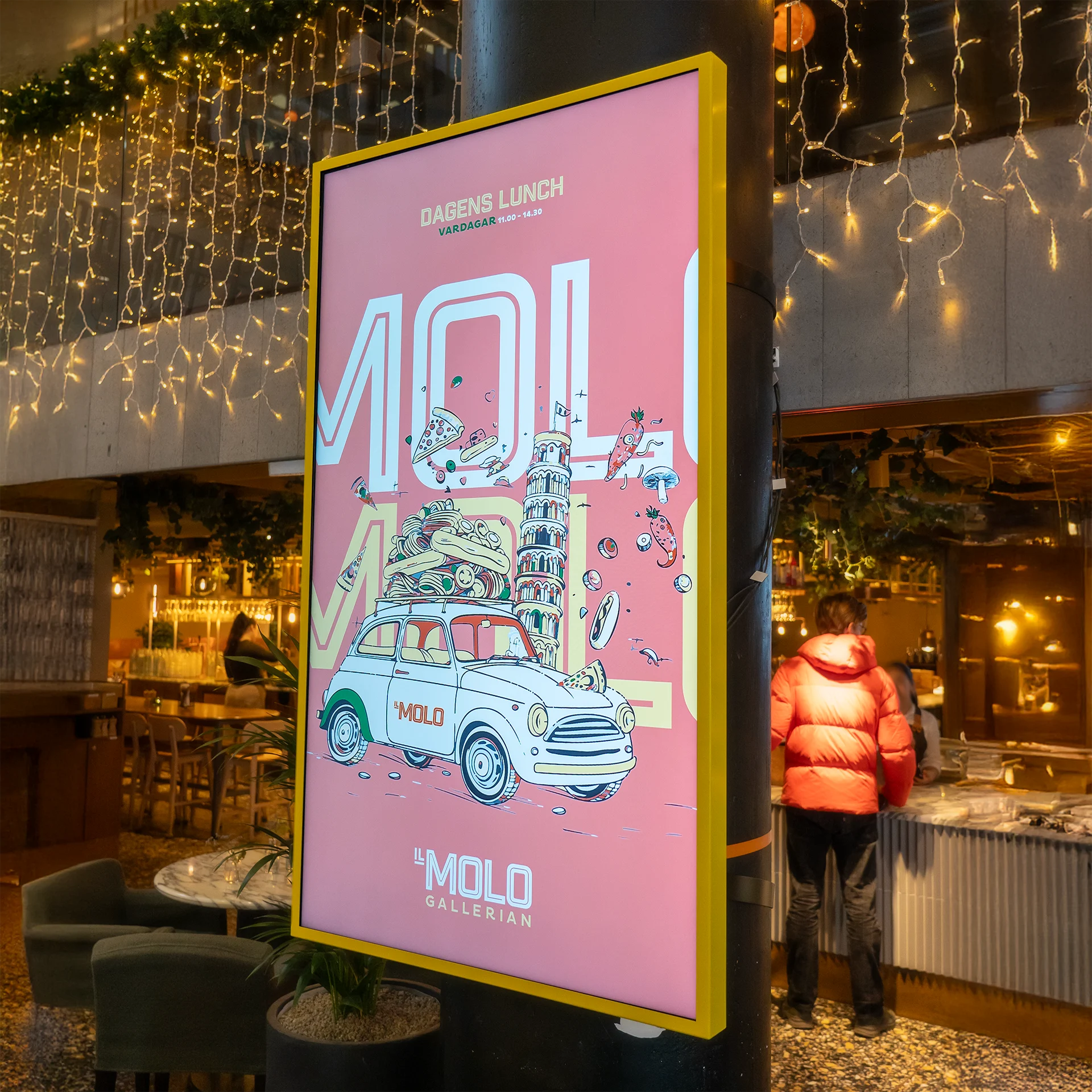 Located in the heart of the Galleria, IL MOLO features a striking portrait display that’s impossible to miss. To make the most of it, they needed eye-catching ads, timely promotions, and scheduled menus for peak hours. We supported them by creating flexible, easy-to-update templates they can refresh whenever needed.