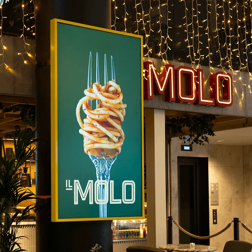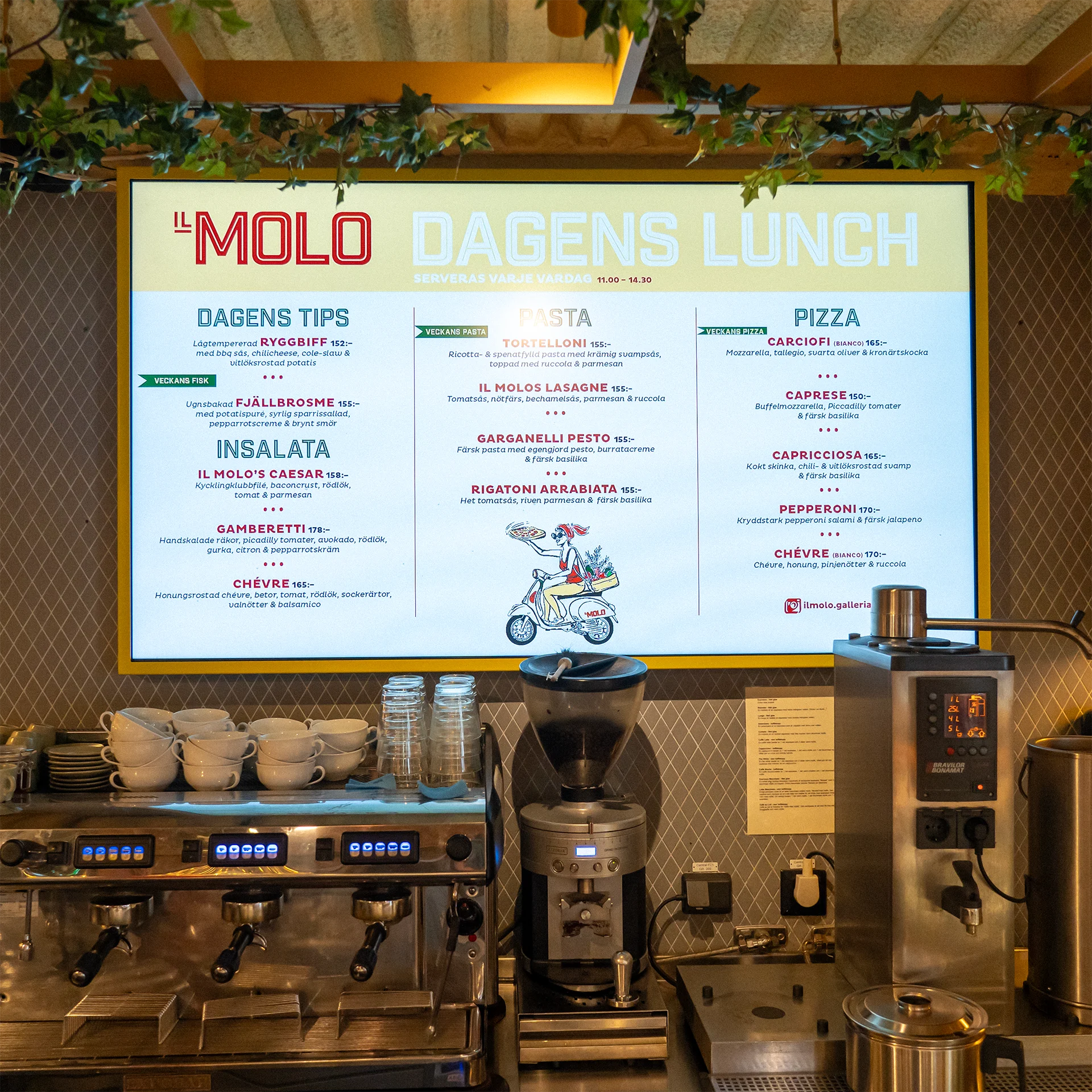 The screens and their content now work together seamlessly. Menus rotate automatically according to schedule, enhancing the restaurant’s flow and perfectly complementing IL MOLO’s vibrant interior design.